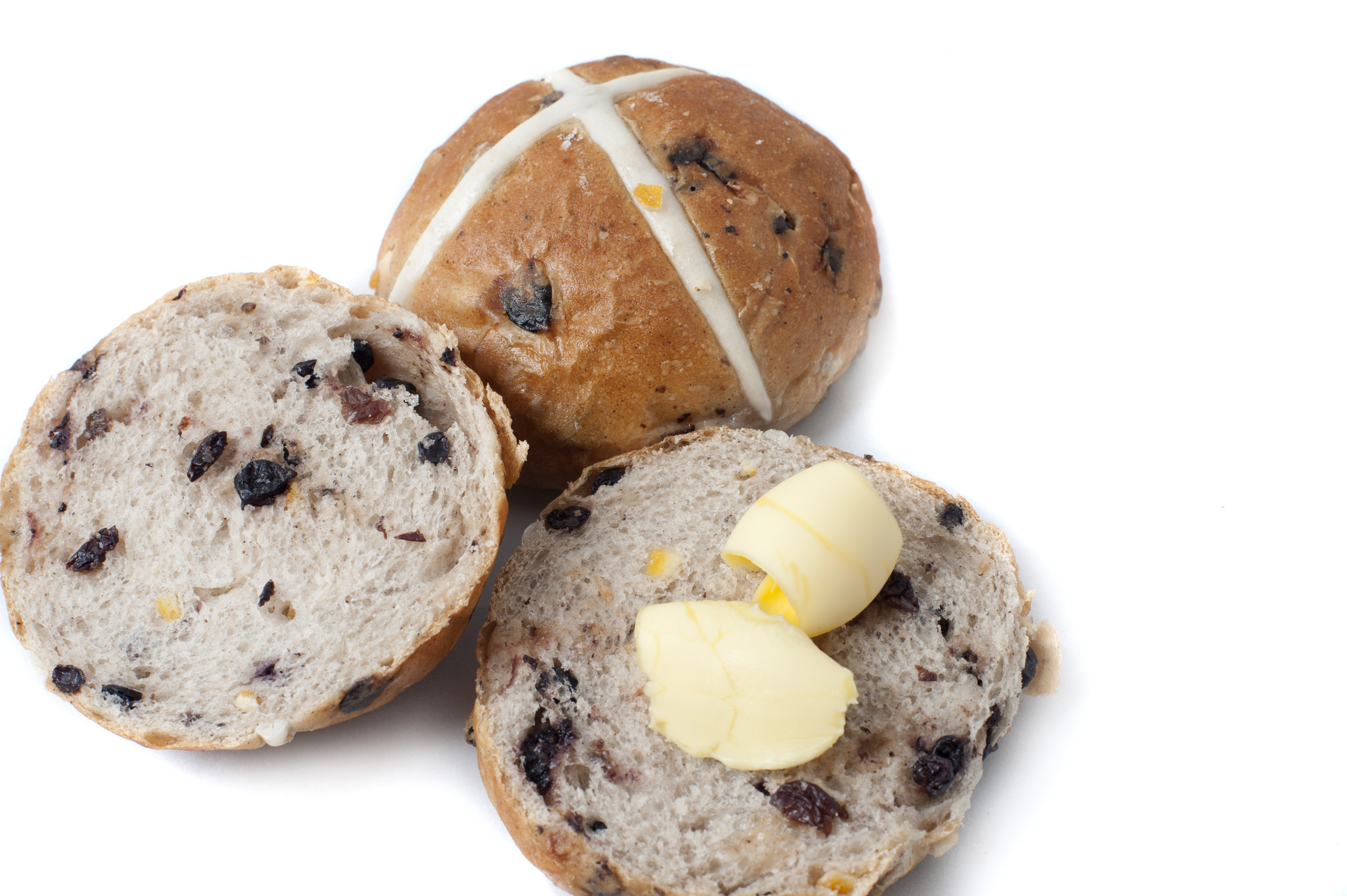 | Freshly baked sliced and whole Hot Cross Buns with butter over white ready for an Easter celebration, with copy space |