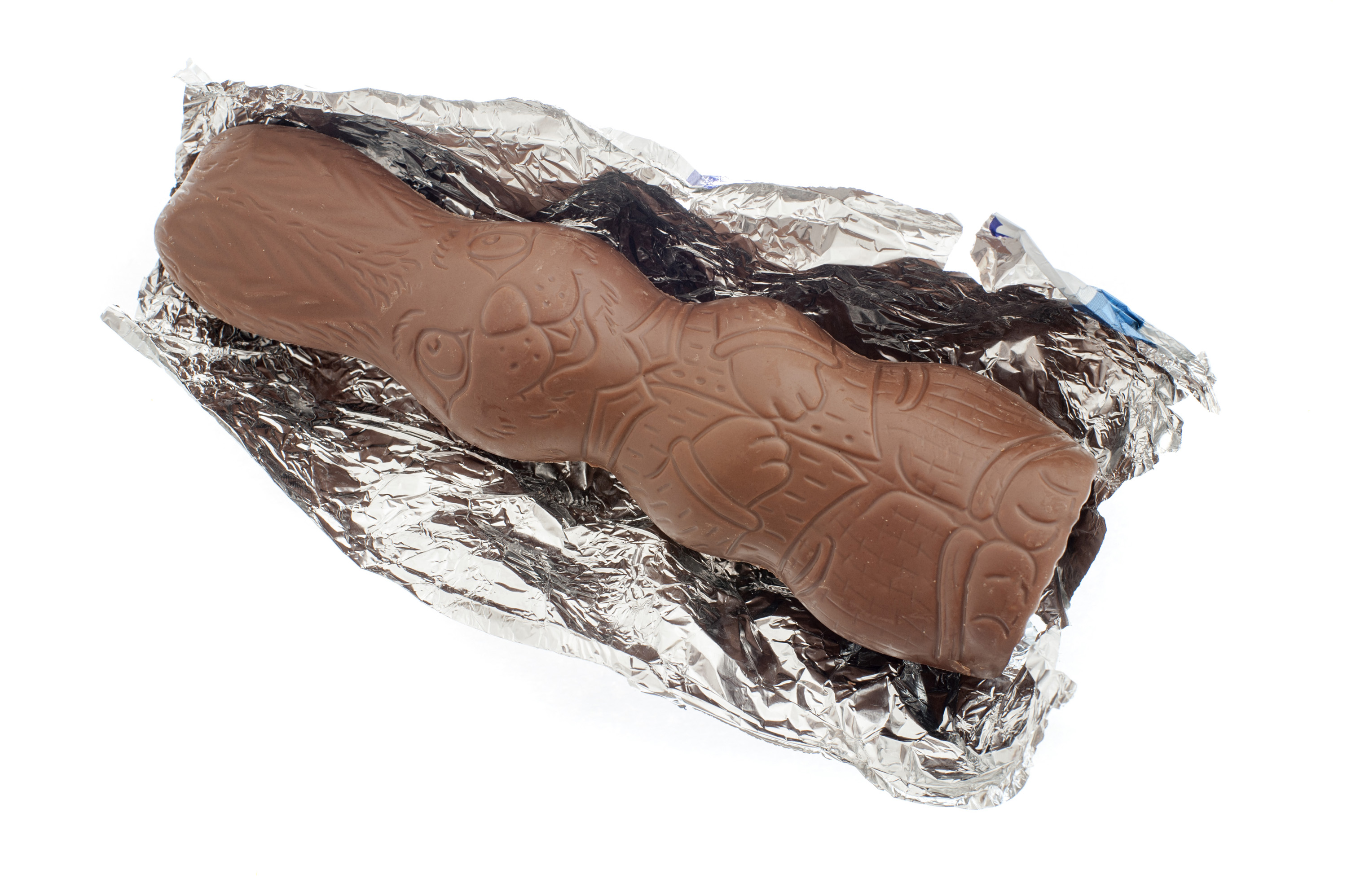 | Image Keywords: candy chocolate confectionery easter egg holiday sweet bunny rabbit foil silver unwrapped wrapping packaging retail white background foil wrapped |